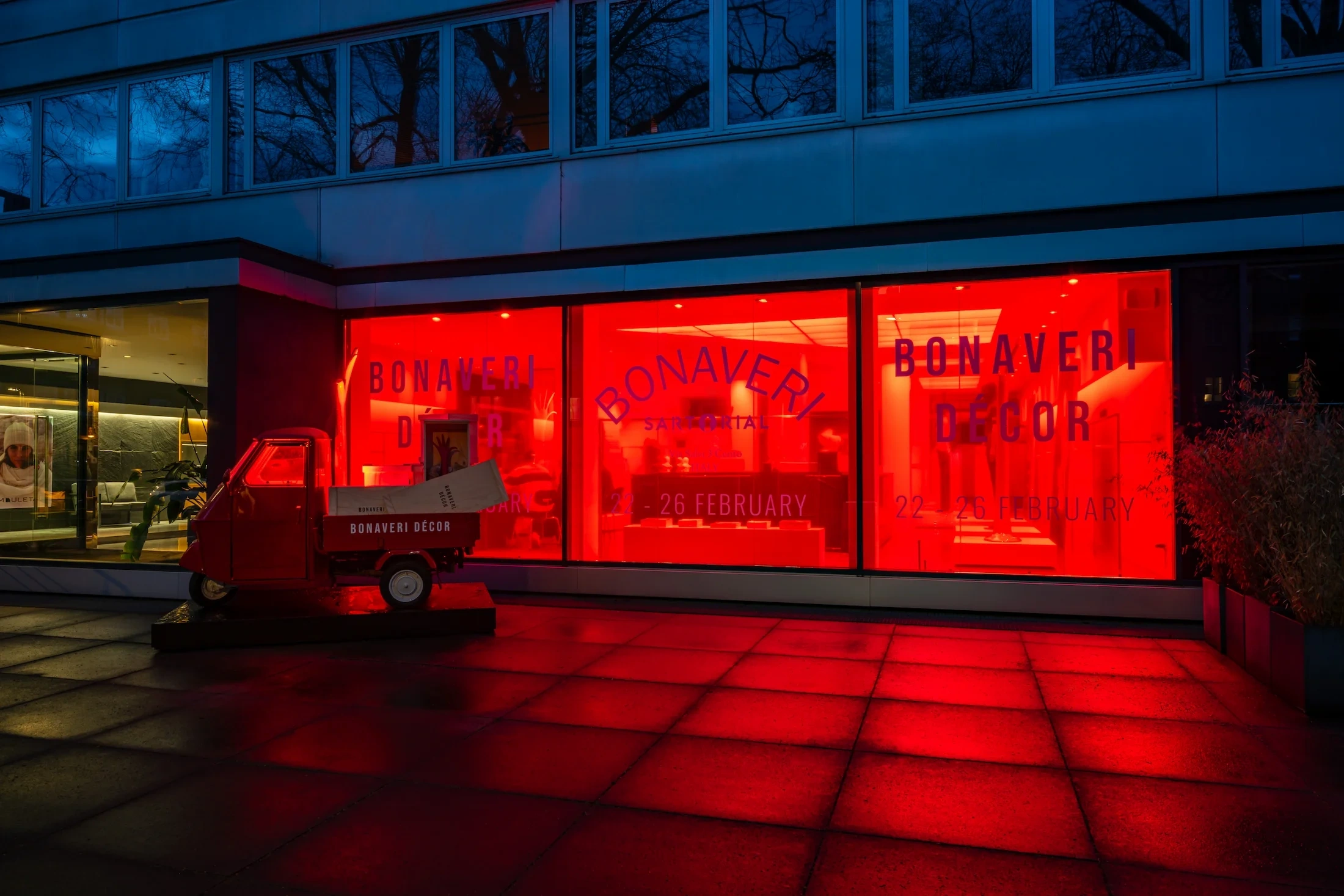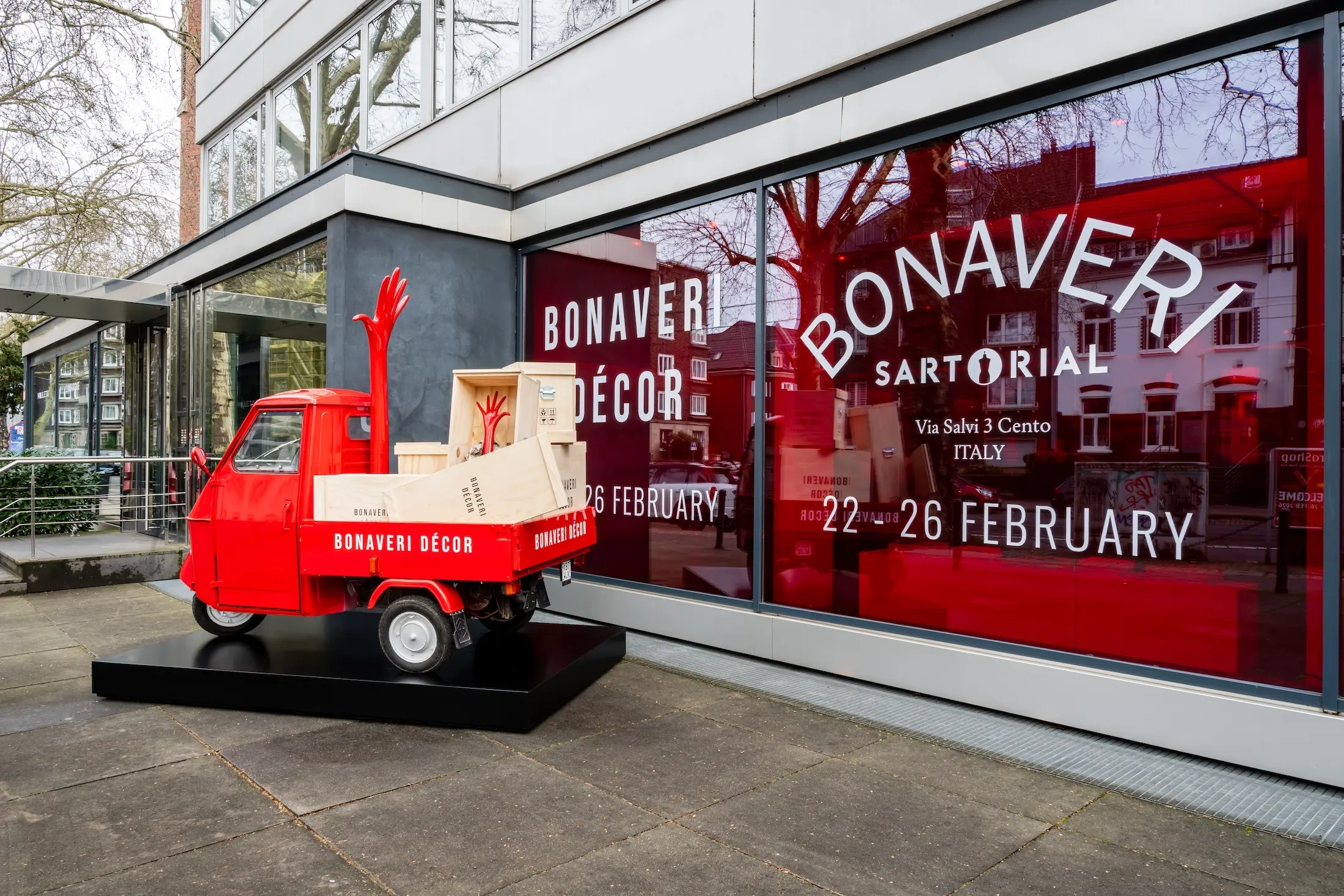 Upon arriving at the showroom, the windows are covered with semi-translucent red vinyl, playfully using Bonaveri Red to attract the attention of passing traffic. The branded Ape van paid homage to an archival Bonaveri delivery van that debuted in the brand’s launch content (Chapter 4) and was parked outside, loaded with the collection’s shipping crates, serving as a humorous nod to nostalgic Italy and the Bonaveri homeland.