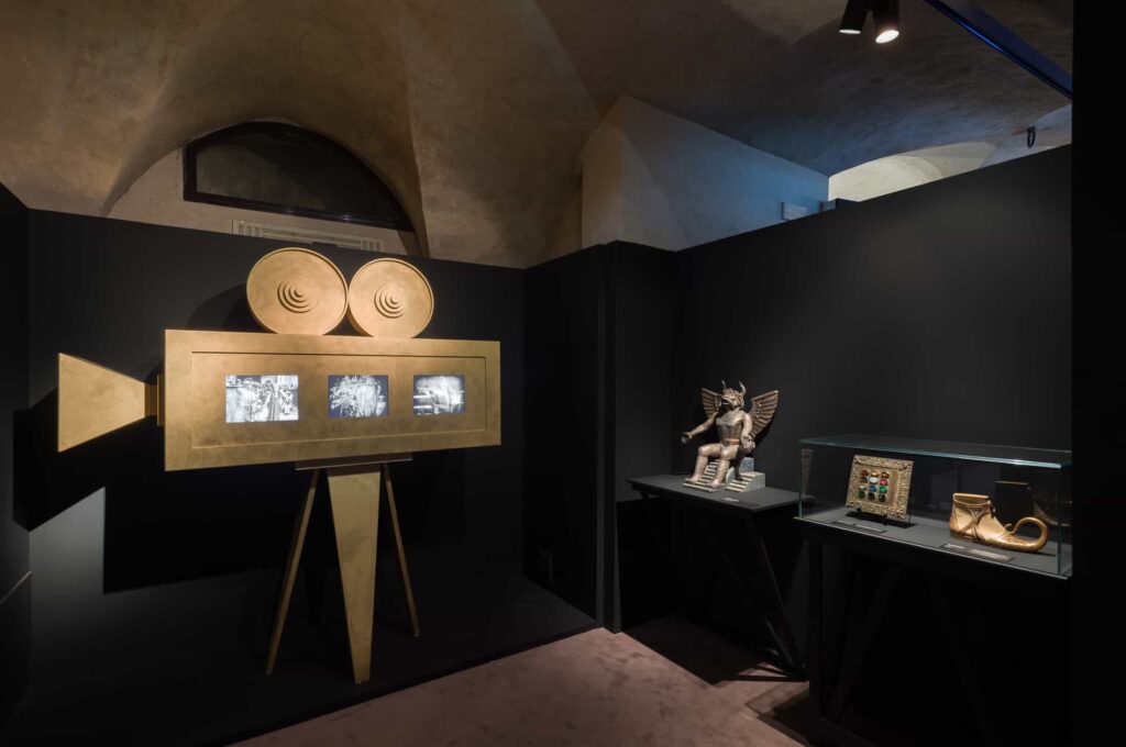 Breaking the monochromatic phase is a regal gown with a medieval flavour in a warm camaïeu of colours, which opens to a series of patchwork dresses inspired by a palette of colours such as ochre, brown, bronze, red, gold, and yellow, with touches of purple and emerald. Earth tones collide with light lace, dark devoré velvet and silk muslin. By sculpting and cutting materials on the bias, they remain malleable and acquire new elastic properties, as seen in the dress composed of a mosaic of shimmering sequins that becomes a modern version of a mystical Byzantine icon. Small shades of metal give way to long-sleeved patchwork dresses in silver, bronze, and gold lamé, paired with mustard-coloured velvet. A group of lace and silk dresses, cut on the bias, are constructed with a single seam that wraps sensually around the body.