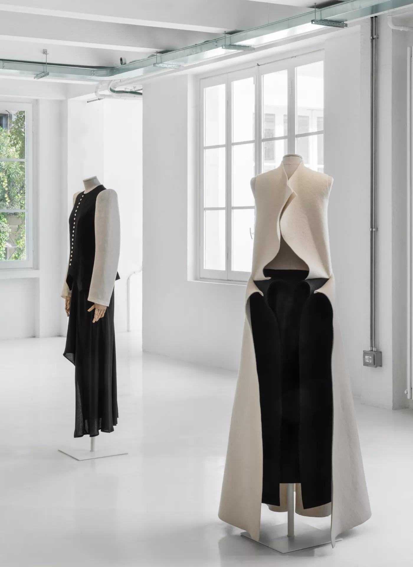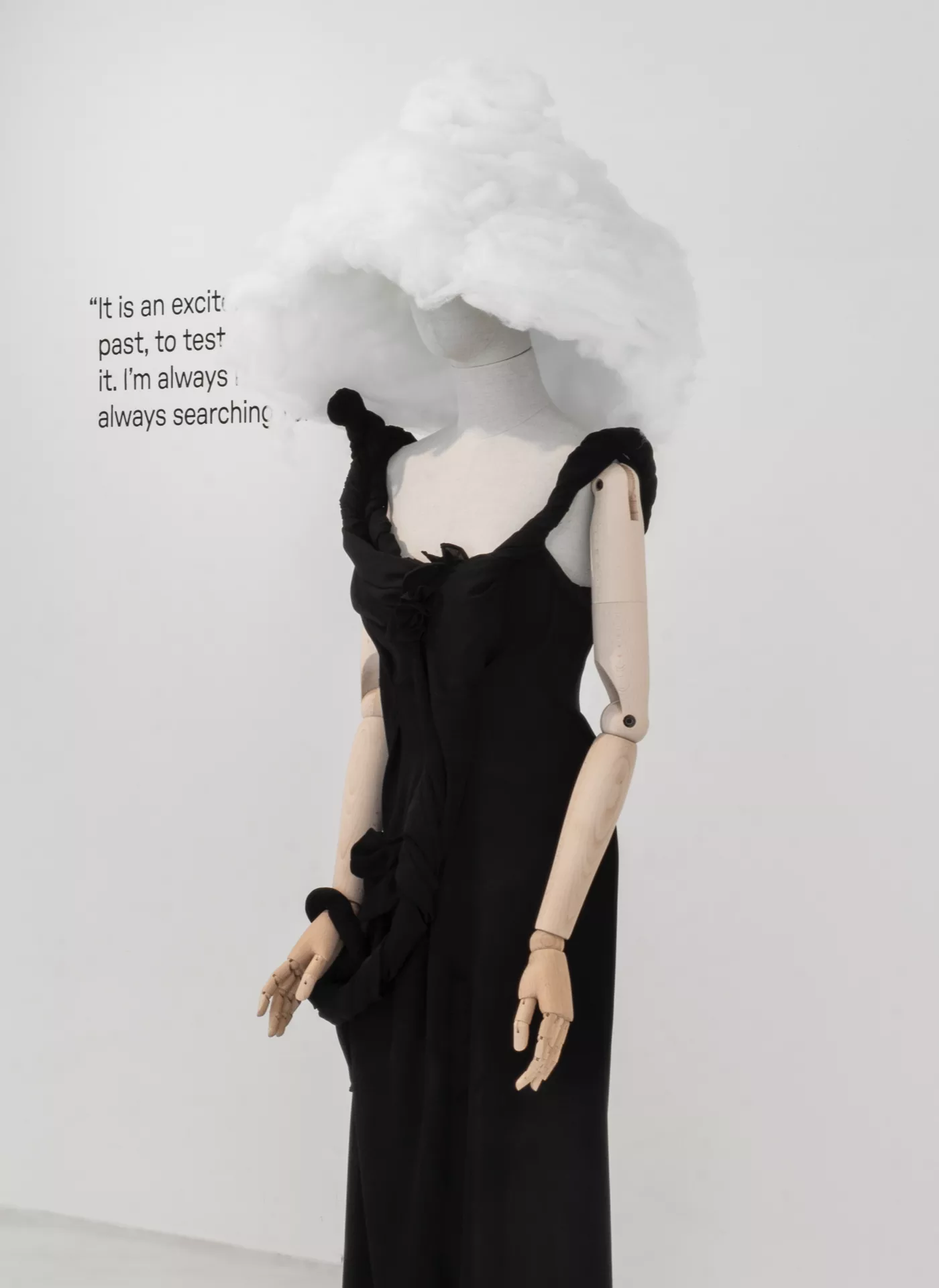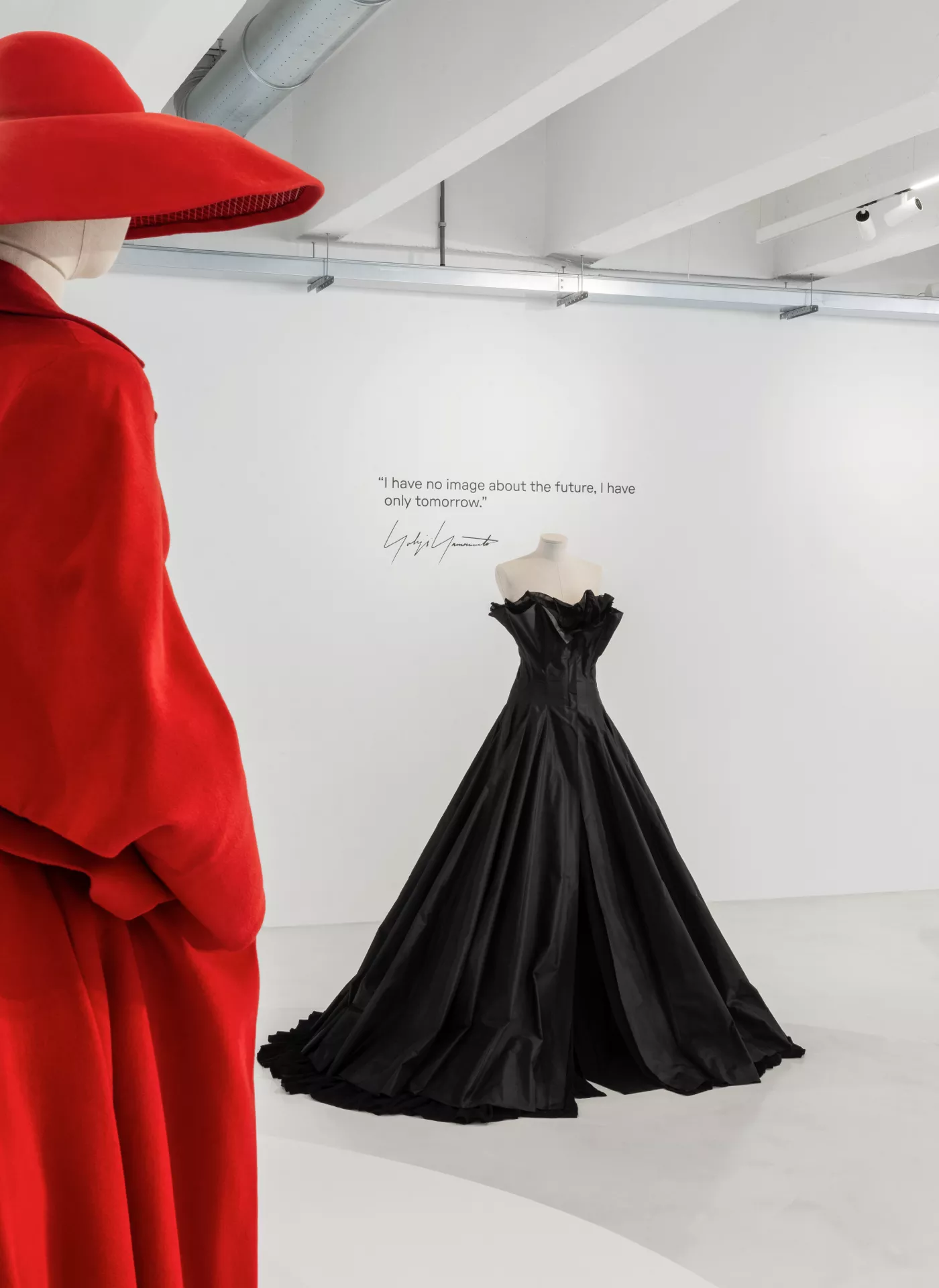 The garments are displayed, without scenic artifice, on the sartorial busts of the Bonaveri Atelier collection, similar to those on which they originally came to life: thus, a path of correspondences is traced between his reflections on the sense of the future – printed on the walls – and a selection of archive pieces, demonstrating his relationship between body and garment in overcoming chronological dimension. Bonaveri busts accompany textures and lines, enhancing garments and forms by bringing out the black color, a cosmic hue mainly used and appreciated by the designer.