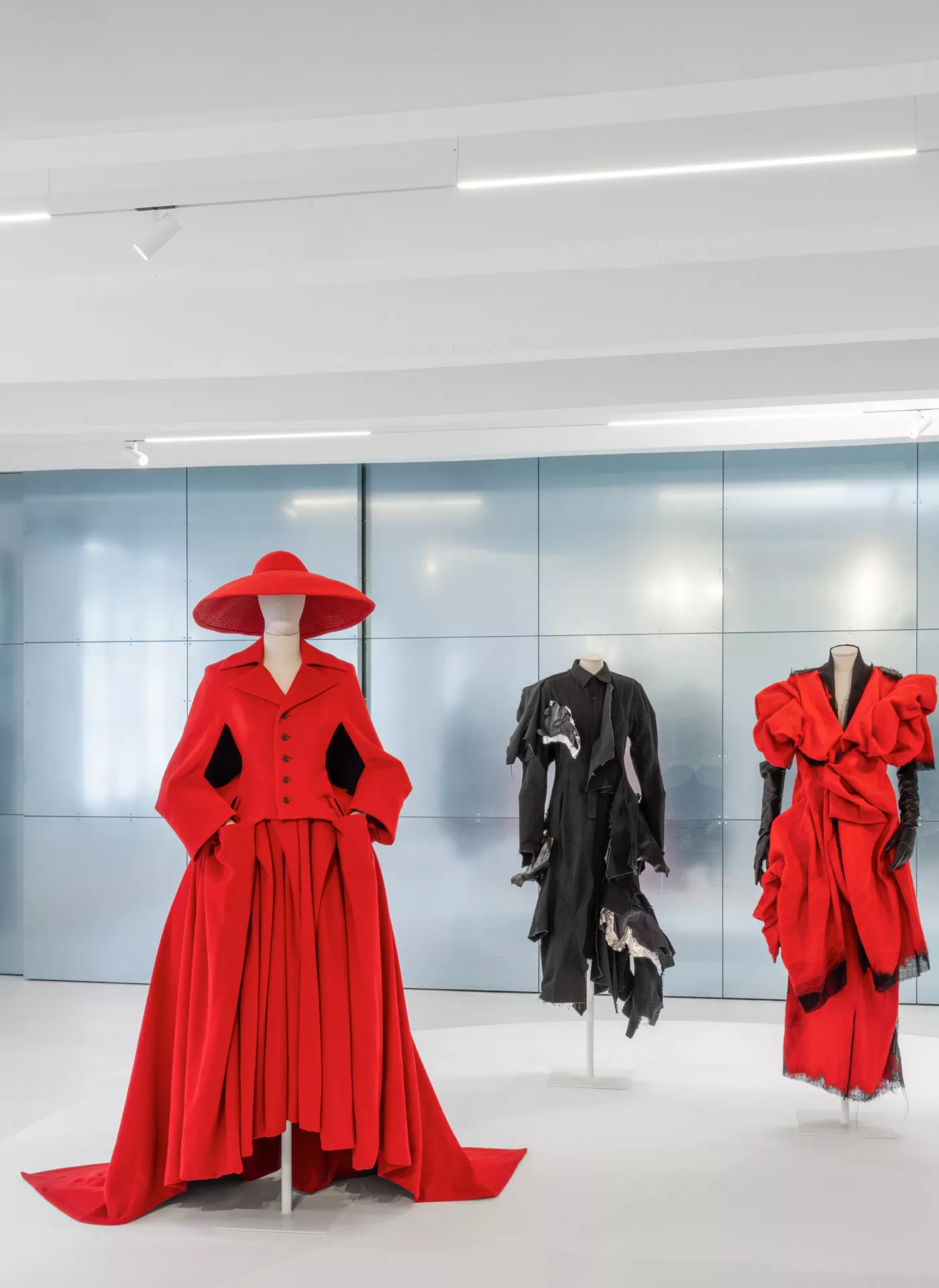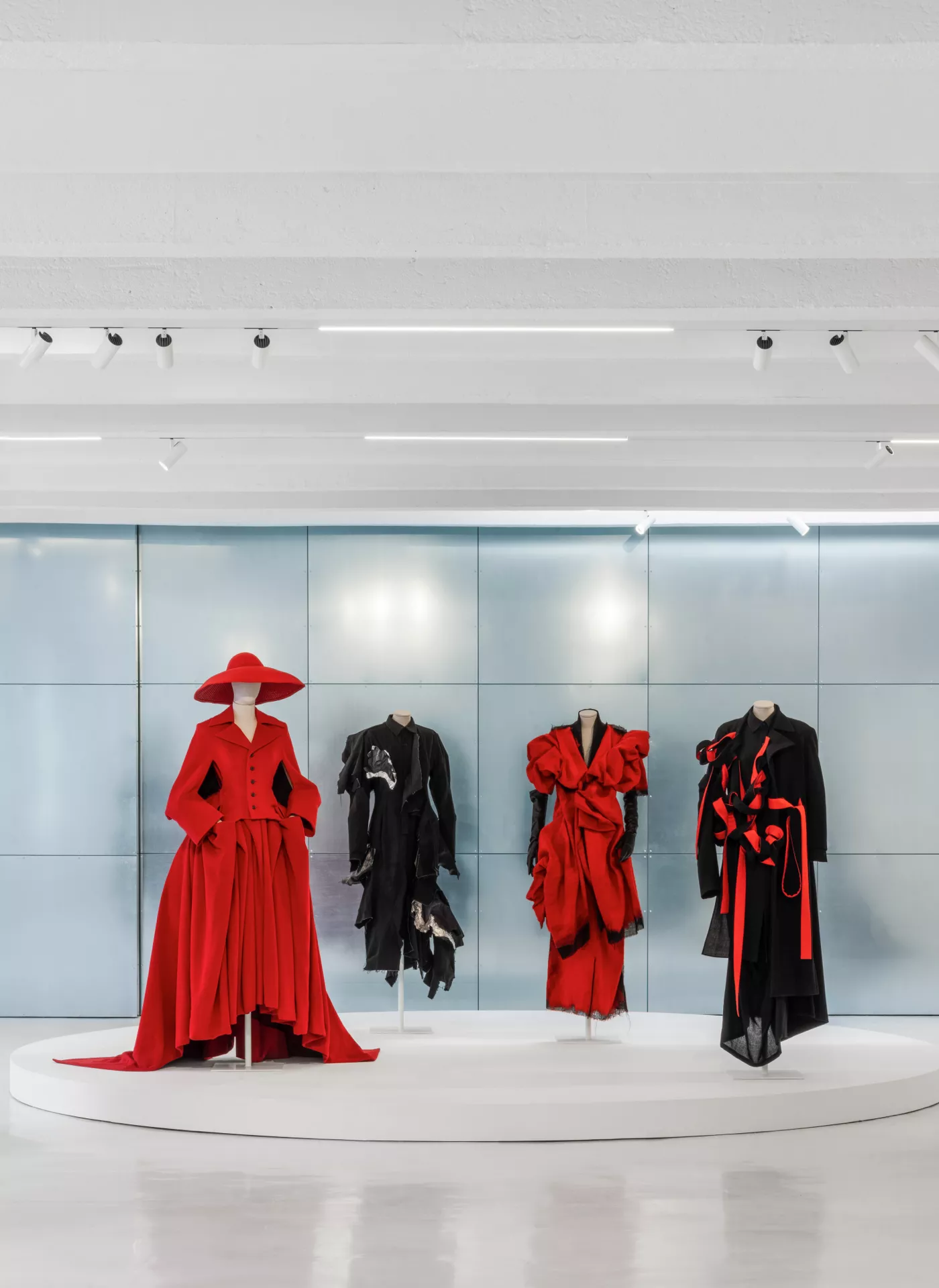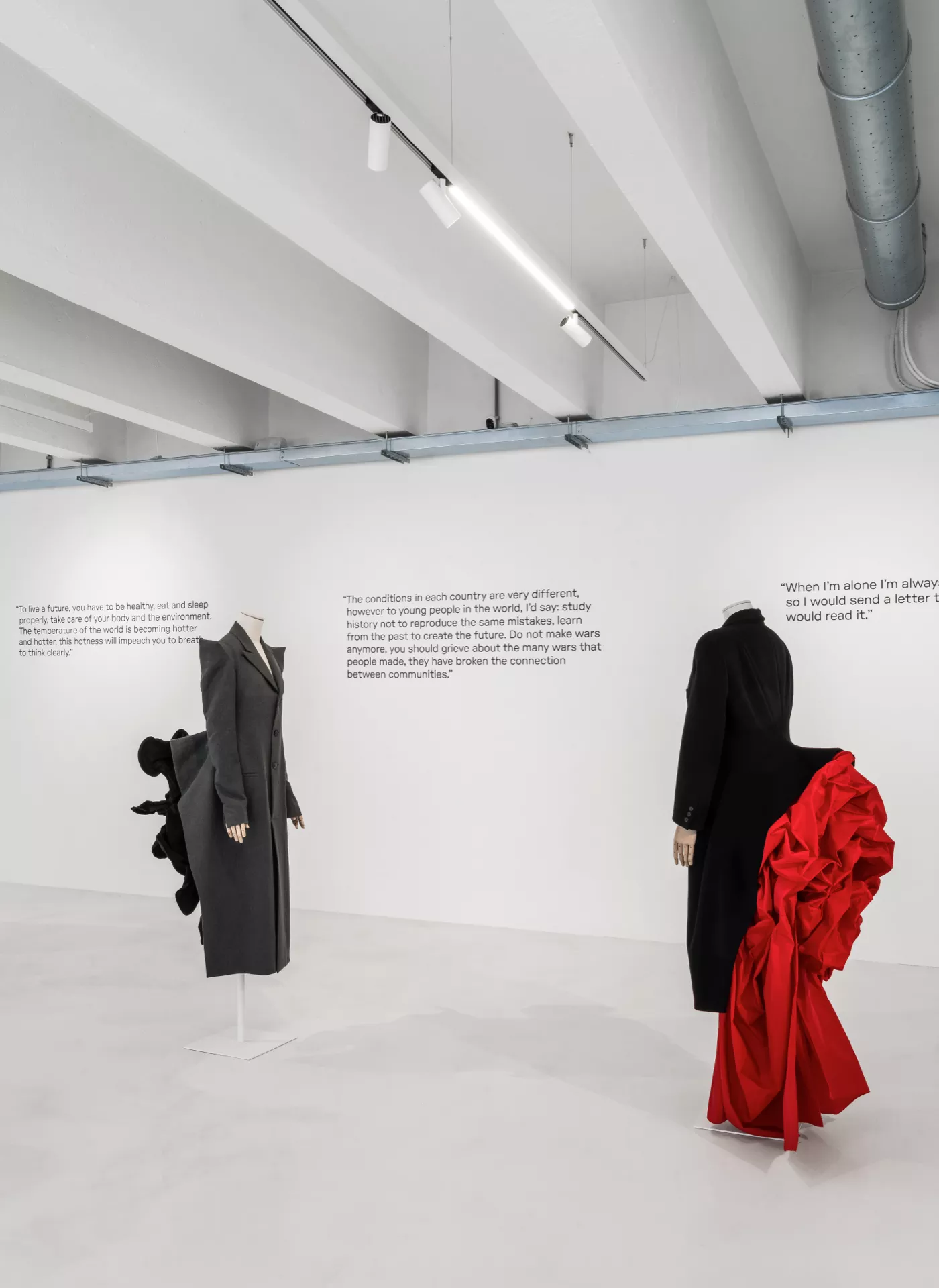 The garments are displayed, without scenic artifice, on the sartorial busts of the Bonaveri Atelier collection, similar to those on which they originally came to life: thus, a path of correspondences is traced between his reflections on the sense of the future – printed on the walls – and a selection of archive pieces, demonstrating his relationship between body and garment in overcoming chronological dimension. Bonaveri busts accompany textures and lines, enhancing garments and forms by bringing out the black color, a cosmic hue mainly used and appreciated by the designer.