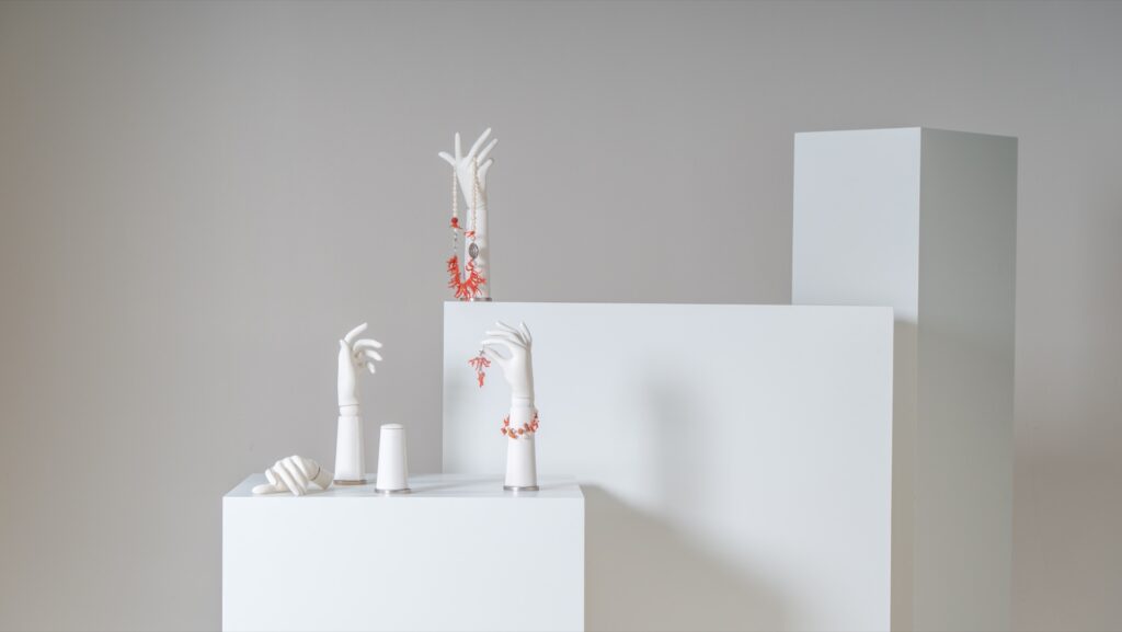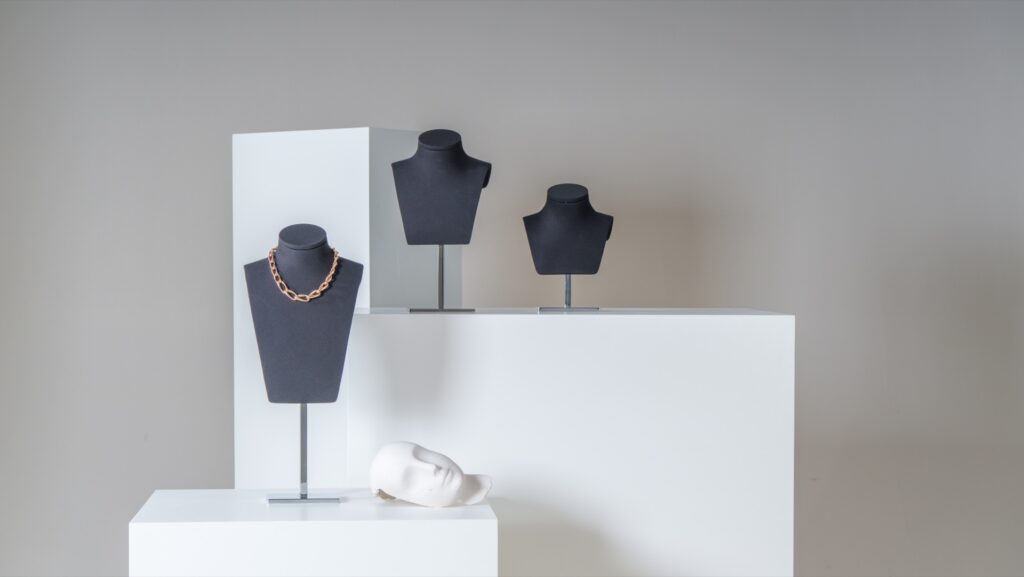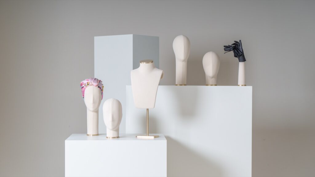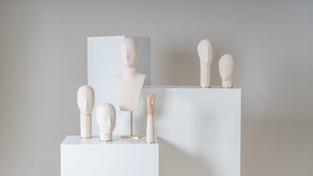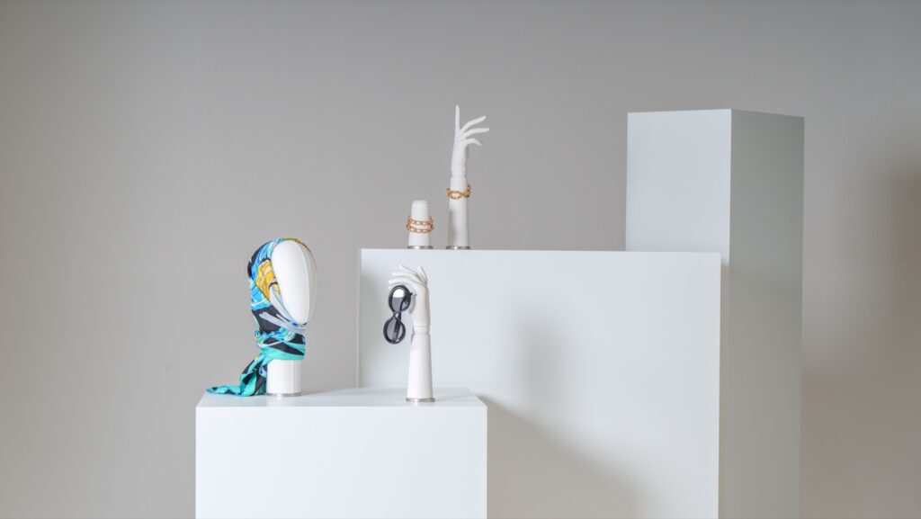 Named Elements, this collection includes a carefully curated selection of hands, heads, busts, cones, bases, and simple geometric supports. These sculptural, anthropomorphic pieces offer fashion, watch, eyewear, and jewelry brands a fresh approach to visual storytelling with elegance and versatility.